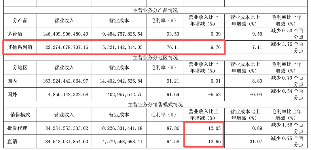 全年,贵州茅台国内外经销商数量大幅扩增232家,但仍难以阻挡批发代理渠道收缩颓势,渠道转型过程中动销衔接不畅。2025年财报数据显示,贵州茅台直销渠道收入845.43亿元,同比增长12.96%,但批发代理渠道收入842.32亿元,同比下滑12.05%,传统经销体系承压显著。