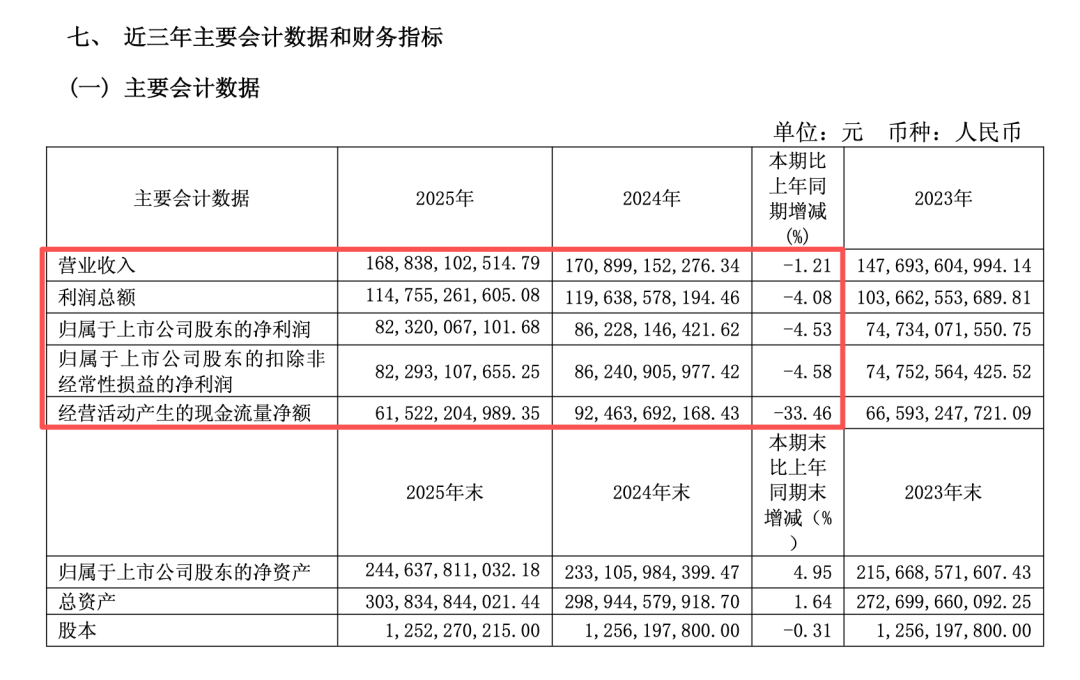 年报显示,贵州茅台2025年营业收入1688.38亿元,同比下降1.21%;净利润823.2亿元,同比下降4.53%;扣非后净利润为822.93亿元,同比下降4.58%;经营活动产生的现金流量净额为615.22亿元,同比下降33.46%。