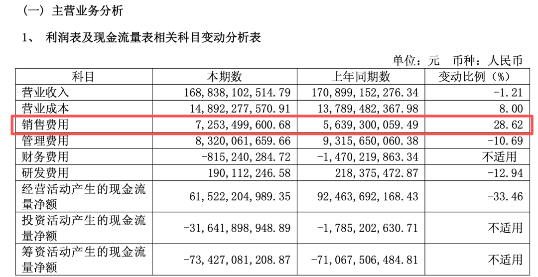 贵州茅台表示,营业收入变动原因主要是酱香系列酒产品结构调整影响所致。尽管如此,贵州茅台仍不遗余力地加大本期广告宣传及市场费用,2025年销售费用高达72.53亿元,较上年度增加16.14亿元,同比增长28.62%。